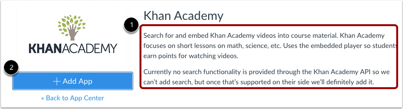 在详情页面上,您可以查看应用程序 [1] 的说明。您准备使用合适的凭证安装应用程序时,可以把应用程序添加为您的课程 [2] 的工具。
