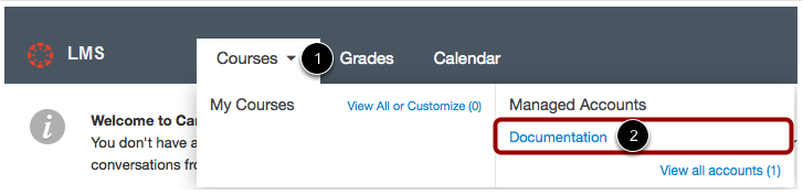 在全球导航,点击课程(Courses)的链接[1],然后点击帐户的名称[2]。