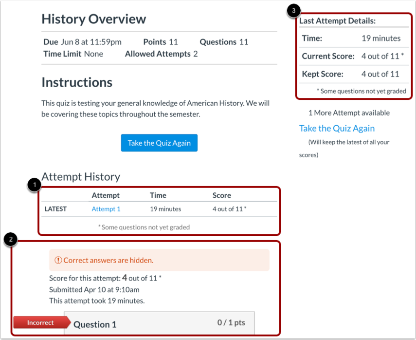 提交项详情 (Submission Details) 是查看测验结果的另一种方式。提交项详情显示在侧栏中,将展示参加测验花费的时间 [1]、您的当前评分 [2] 以及您的保留评分 [3],保留评分是 LMS 在评分册中存档的评分。