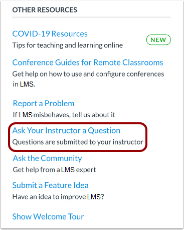 向讲师提问 (Ask your instructor a question) 链接允许您在任何活跃的课程中直接从帮助页面联系讲师或助教。