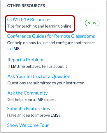 利用新型冠状病毒 LMS 资源 (COVID-19 LMS Resources) 链接,用户可以查看关于使用 LMS 在线学习的提示。