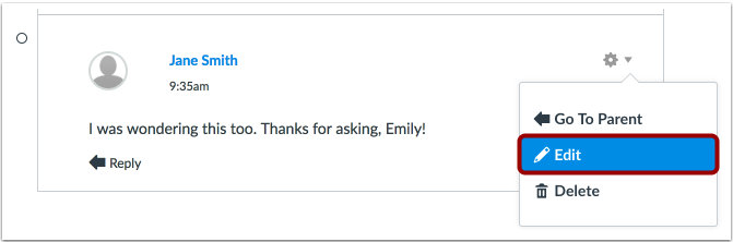 每个帖子都有一个设置图标,其中包含编辑和删除的选项。您想修改讨论帖子上,点击设置 (Settings) 图标。