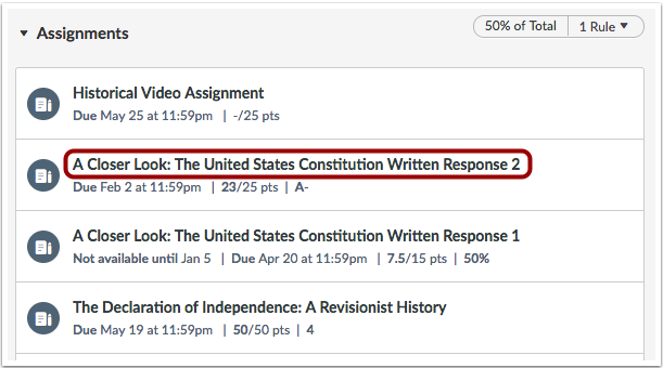 如果您有一个同侪评审,作业页面则不会显示一个图标。 如果您知道同侪评审作业的名字,点击标题,打开作业。