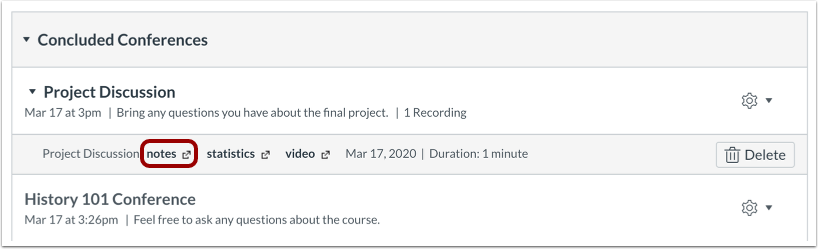 您可以点击会议的设置 (Settings) 菜单 [2],然后点击删除 (Delete) 选项来删除已结束的会议。
