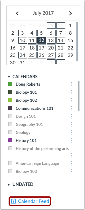 日历 iCal 馈送位于日历侧栏内。您可以把 iCal 馈送导入至任何接受 iCal 格式的日历应用程序内,例如 Google 日历、, Apple 日历、Outlook, 和 Yahoo 日历。您也可以把日历馈送下载为 ICS 文件。日历馈送将包含您LMS日历中的所有活动和作业。