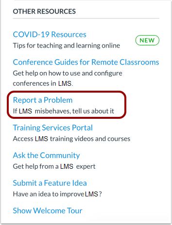 - 报告一个问题 (Report a Problem) [4]:向我们的支持团队提交与 LMS 有关的问题