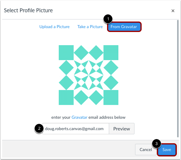 点击来自 Gravatar(From Gravatar) 选项卡 [1] 并在已提供的栏中 [2] 输入您的 Gravatar 电子邮箱地址。点击预览(Preview)按钮查看您的 Gravatar。当您完成时,点击保存(Save)按钮 [3]。
