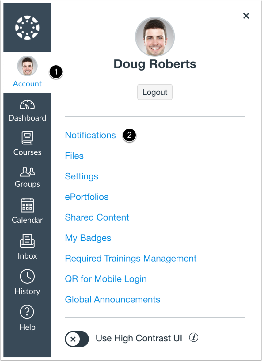 在全局导航中,点击账户(Account)链接[1], 然后点击通知 (Notifications) 的链接[2]。