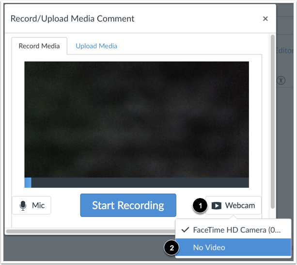 要只录制音频,请点击网络摄像头 (Webcam) 按钮 [1],并选择无视频 (No Video) 选项 [2]。
