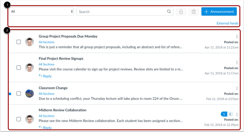 公告索引 (Announcements Index) 页面设计成在页面顶部带有全局设置 [1],其后跟随单个公告 [2]。