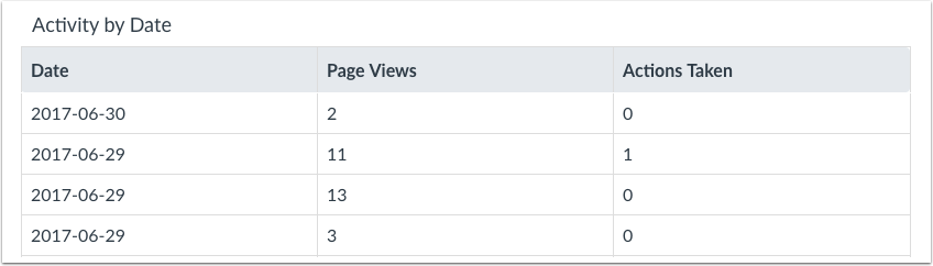 活动日期图表显示学生的全部课程活动。x轴表示课程日期,y轴表示页面的浏览次数。深蓝色柱形条表示参与的课程。如果日期仅包括页面的浏览次数,则柱形条只显示为浅蓝色。