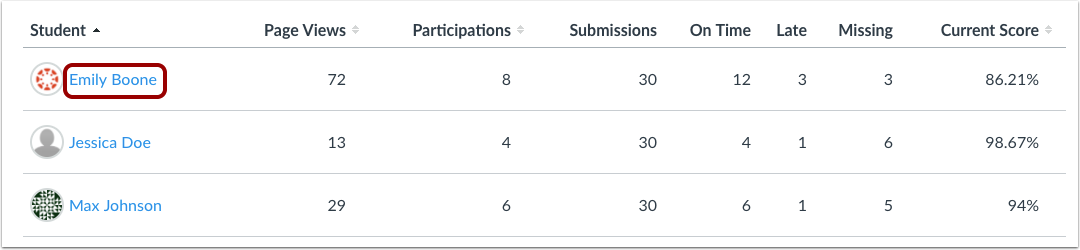 在学生数据分析(Student Analytics)表格里点击学生姓名。