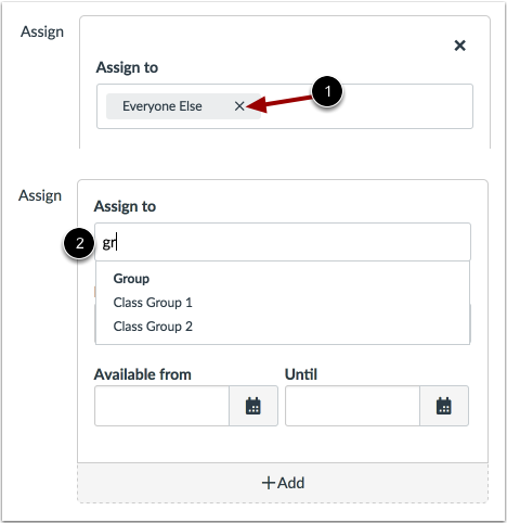 在默认情况下,LMS 把作业设置为课程中的每个人。要在组集里为特定的小组创建作业,点击每个人(Everyone)的移除图标[1],然后开始键入一个小组的名称[2]。搜索栏目是动态的;当小组名出现时,点击名称。列表是不可滚动。
