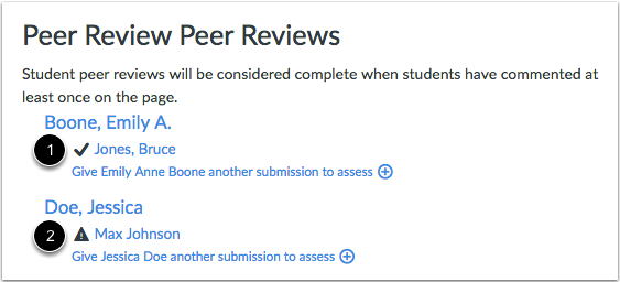 已分配同侪评审会显示在学生姓名下方。 对号(Checkmark)[1]表示同侪评审已完成。警示三角(a Caution Triangle)[2] 表示同侪评审尚未完成。
