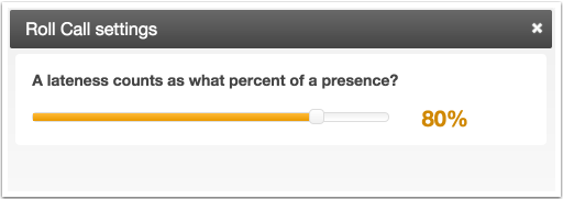 您可以为点名调整设置与调整迟到的分值。 在默认情况下,LMS 将迟到标记列为出席的80%。 例如,一个学生有一个出席(100%)和一个迟到(80%)将有一个90%的平均考勤分数。