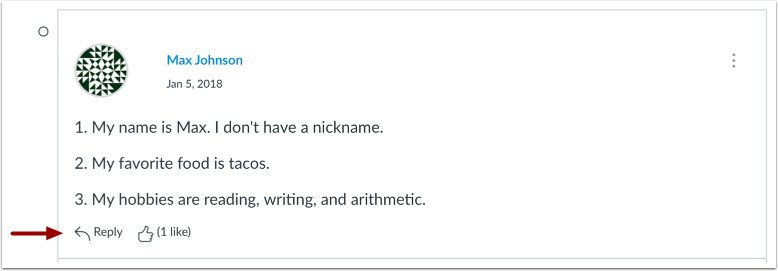 在一个主题讨论,您可以回复别的学生已发布的评论。找出您想回复的粘贴,点击回复(Reply)图标。