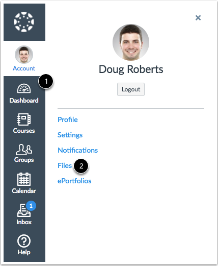 在全局导航,点击账户 (Account) 链接[1],然后点击文件(Files) 链接[2]。