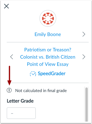 对于未计入最终评分的作业,评分详情托盘警告图标 (Grade Detail Tray Warning Icon) 会显示一个警告图标。如果选择了不要将此作业计入最终评分 (Do not count this assignment towards the final grade) 选项,或此作业属于某个没有加权百分比的加权作业组,则就会显示这个图标。
