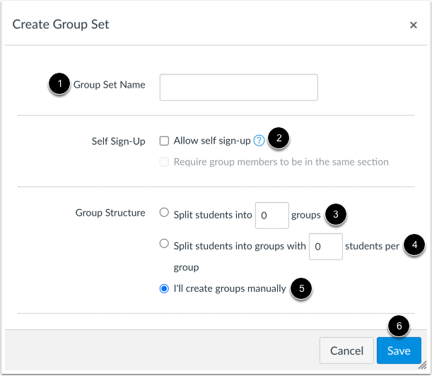 要手动创建小组或使用 CSV 文件创建小组,请点击我将手动创建小组 (I'll create groups manually) 单选按钮 [5]。