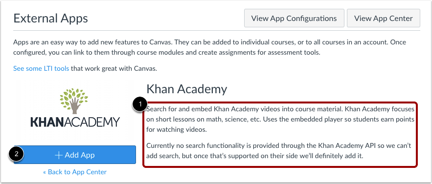 注意:LMS 应用程序中心 (App Center) 并不总是包含与应用程序相关的所有信息。您可能想要访问教育应用程序中心 (Edu App Center),获取与您想要配置的外部应用程序相关的完整信息。