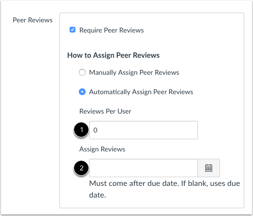 如果您自动分配同行评审,该菜单将展开。在每个用户评审 (Reviews Per User) 字段 [1] 中,输入每个学生需要完成的评审的数量。在分配评审 (Assign Reviews) 字段 [2] 中,使用日历图标选择同行评审分配给学生的日期或手动输入该日期。