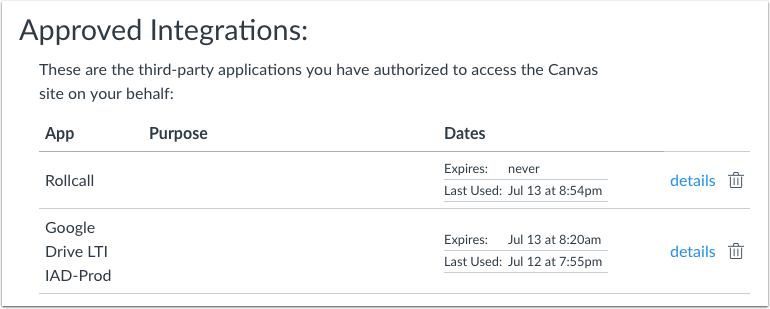 当您允许第三方整合访问您的帐户时,验证整合部分将显示,而且还显示授权的整合。每个整合将显示您的应用程序的名称、目的(如果被注意),应用程序上次使用的日期,应用程序最后的使用日期,以及查看更多详细信息的链接。
