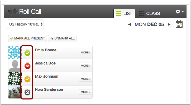 出勤评分册 (Attendance Gradebook) 列将在您每次在出勤 (Attendance) 工具中点名时更新。